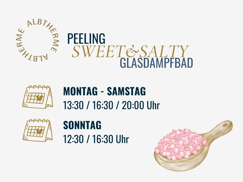 Das kostenfreie Salzpeeling gibt es täglich im Glasdampfbad (Gemischter Bereich) zu den folgenden Zeiten: